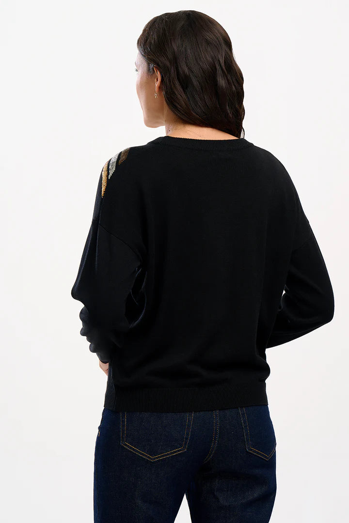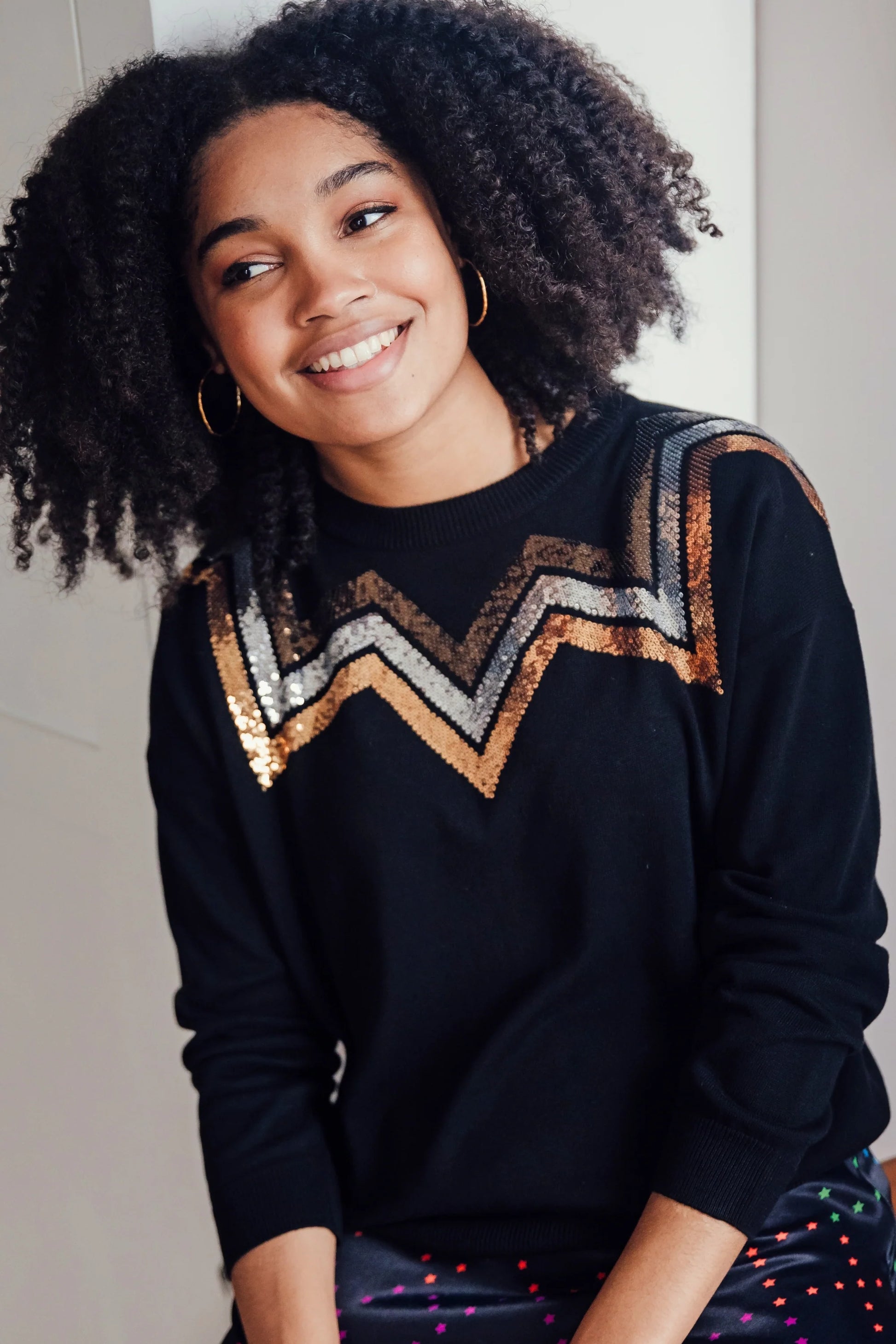 Finishing mid-hip the Anjali has a relax fit with a round neckline and ribbed trims along the hemline, cuffs, and neckline. Featuring shiny sequin design around the chest and shoulders. Pair with a satin midi skirt and heels to dress up, or jeans and boots for a more casual look.